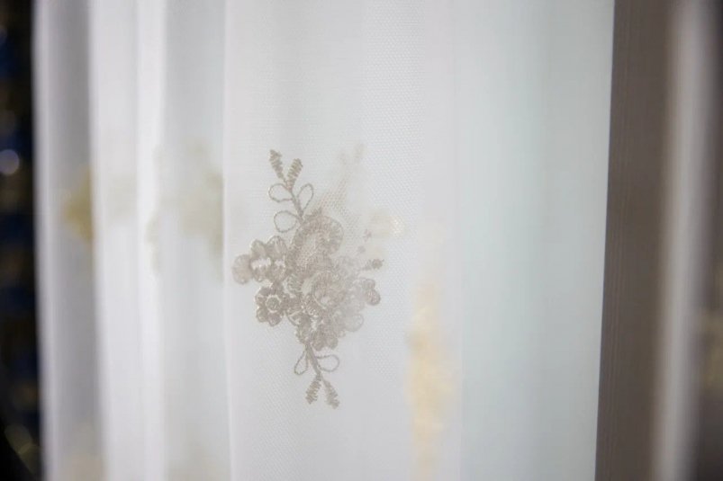 На кухне повесили арочные кружевные занавески по 684 рубля — уютно и функционально. На застеклённом балконе с панорамным окном (9 метров) установили тюль с рисунком "молния": почти невидимый спереди, с лёгкими сине-серебристыми отблесками сбоку. Его стоимость — 977 рублей за 6 метров.