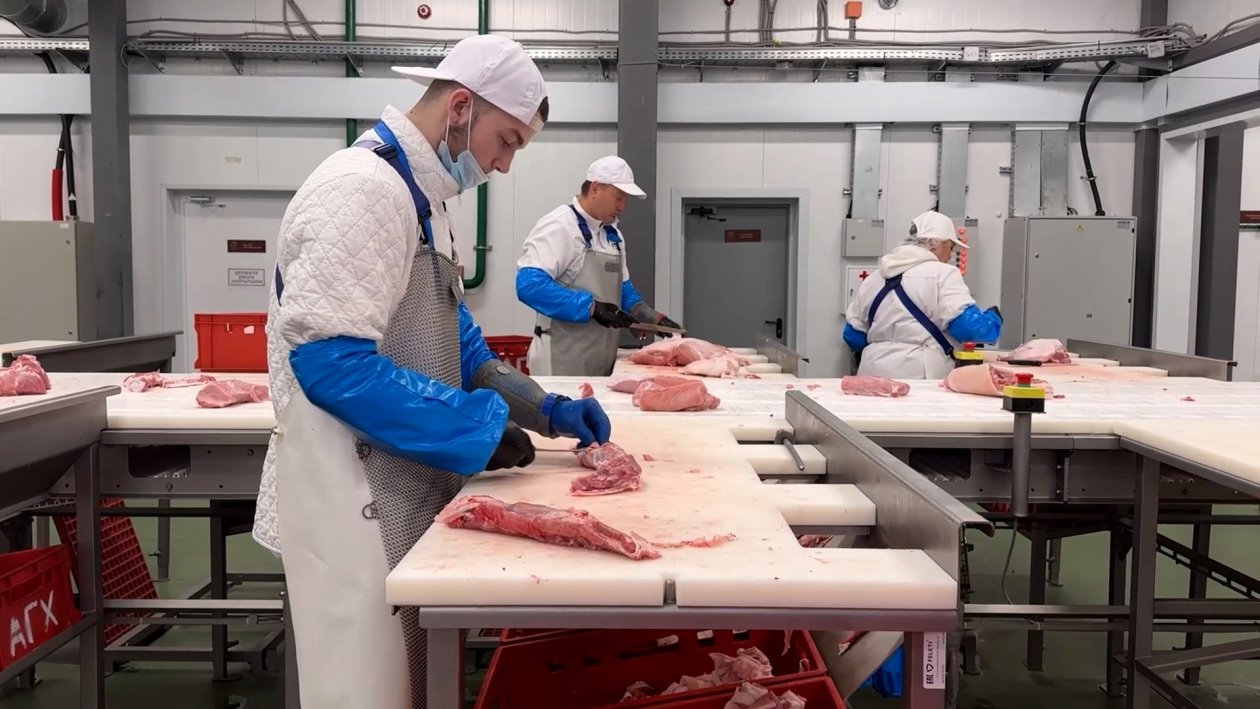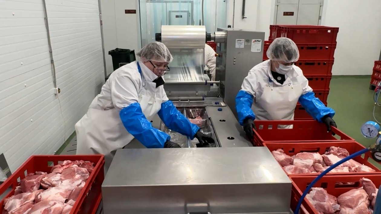 Особое внимание губернатор уделил мясному цеху, запущенному в 2025 году. Это единственное на Дальнем Востоке предприятие полного цикла — от полутуши до готового полуфабриката. Мощность цеха — 20 тонн в смену (440 тонн в месяц при полной загрузке). Ассортимент включает более 70 видов продукции: крупнокусковые и мелкокусковые полуфабрикаты, изделия в маринаде, панировке, котлеты, фарш, копчено-вареные деликатесы. В этом году запустят производство пельменей. Предприятие обеспечивает 62% регионального производства полуфабрикатов и 20% деликатесов. Здесь работают 59 человек.